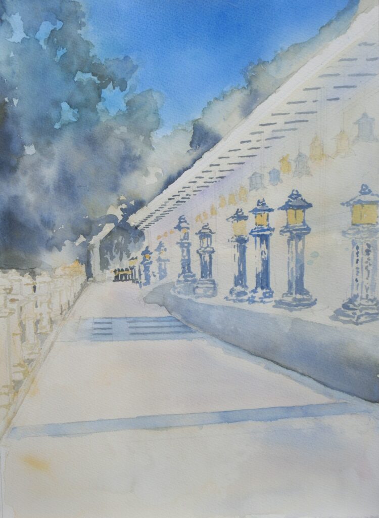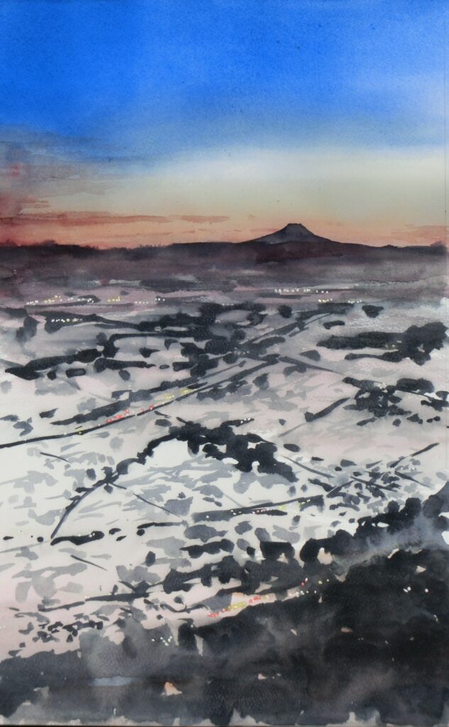 手前の村落の表現は、散在する明かりをマスキングで残しつつ、後でつぶれてしまうのですがグレーで描き込んでおきます。