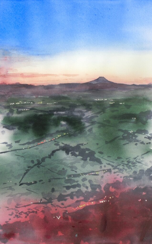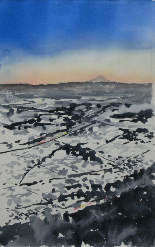 筑波山の旅館から眺めた夕景が魅力的だったので、これを描いてみます。